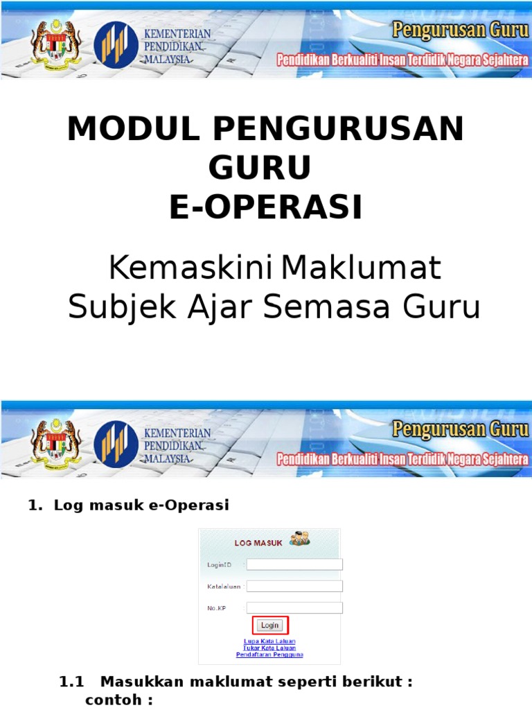 Setelah kemaskini, sila pastikan anda klik kemaskini bagi tujuan data disimpan dan. Klik sini untuk mendapat maklumat lebih lanjut. Antaranya berkaitan status pertukaran sekolah, kenaikan pangkat dan latihan. Kad pengenalan serta senarai menu akan ditunjukkan di sebelah kiri. E operasi merupakan salah satu modul bagi sistem pengurusan sekolah sps kementerian pendidikan malaysia kpm di bawah pengurusan guru. 1 pengisian maklumat didalam eoperasi wajib di kemaskini. Setelah log in, sila semak dan lakukan pengemaskinian data maklumat guru anda. Sistem kemaskini maklumat guru kpm dan cara daftar pengguna baru. Seandainya terdapat maklumat tidak tepat, anda perlulah memaklumkan kepada pk1/pk2/pk3 untuk kemaskini. Kemaskini maklumat guru & semakan status online. E operasi merupakan salah satu modul bagi sistem pengurusan sekolah sps kementerian pendidikan malaysia kpm di bawah pengurusan guru. Kementerian pendidikan malaysia kpm menyedari trend teknologi maklumat ict yang bergerak cepat hari ini. Semua bahagian sektor operasi pendidikan iaitu bahagian pendidikan teknik dan vokasional, bahagian sukan, bahagian kokurikulum dan kesenian serta bahagian pengurusan sekolah berasrama penuh dan sekolah.