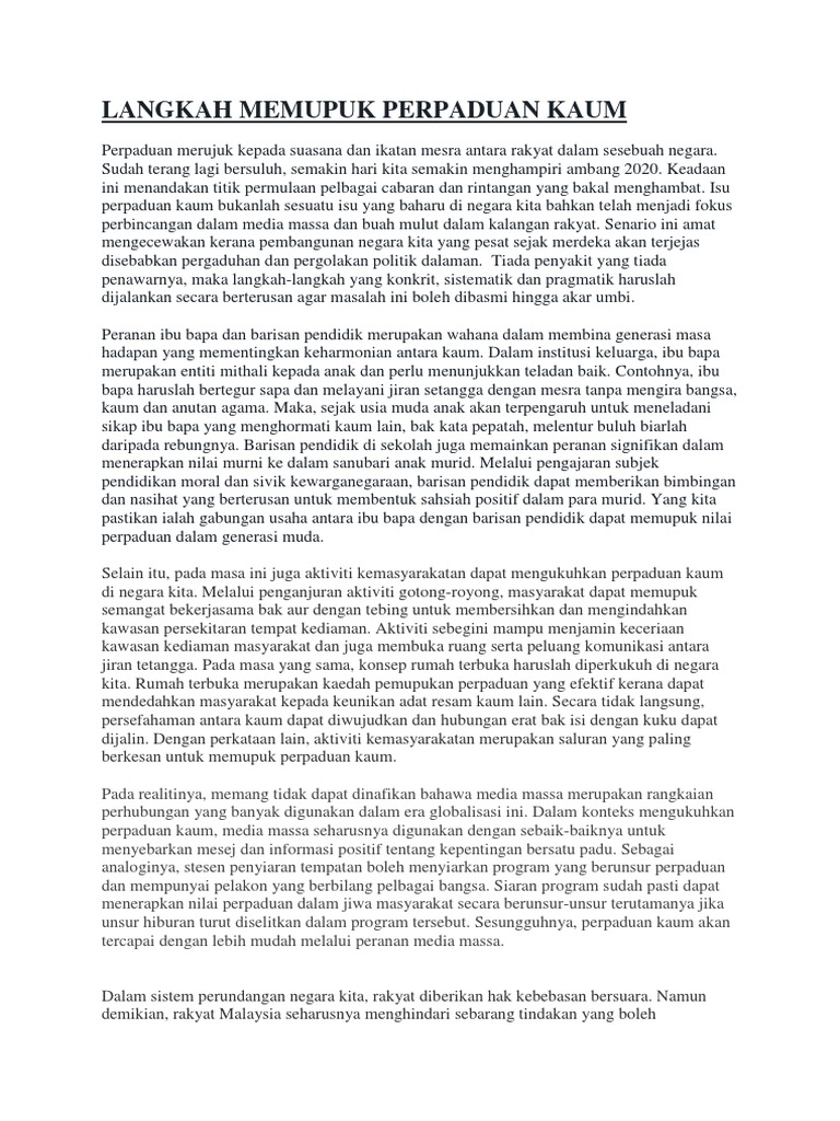 Cadangan Mewujudkan Perpaduan from imgv2-2-f.scribdassets.com Peranan remaja dalam memupuk perpaduan kaum. Cara mengekalkan perpaduan kaum : Ia bukan sahaja tempat untuk menimba ilmu malah ia juga menjadi alat memupuk perpaduan di kalangan pelajar. Malaysia merupakan satu negara yang unik dimana ia merupakan satu negara persoalan hubungan etnik, perpaduan dan integrasi amat penting bagi mewujudkan kestabilan politik dan seterusnya pembangunan negara. Lebih baik jika dapat meluangkan. Masalah perpaduan kaum yang paling ketara dan masih diingati sehingga kini ialah peristiwa 13 mei 1969. Dengan cara ini, generasi malaysia yang lebih bersefahaman, bekerjasama dan bersatu padu mampu dilahirkan. Langkah mengekalkan dan memantapkan perpaduan kaum.