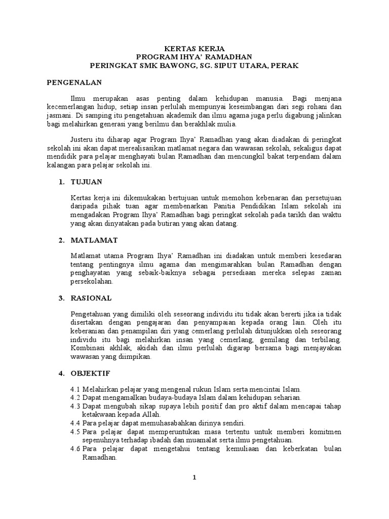 Kertas Kerja Ihya Ramadhan from img.pdfslide.net Kertas kerja dibentangkan pada seminar pibg peringkat kebangsaan: Sebenarnya, itu hanya pengenalan sahaja dan ada lebih banyak. .kerja 4 tahun sekolah, rencana kerja tahunan sekolah (rkts), rkks (rencana kerja kepala sekolah). Membudayakan penghayatan dalam ibadat berpuasa di bulan ramadhan 2. Sekolah menengah kejuruan smk adalah salah satu bentuk satuan pendidikan formal yang menyelenggarakan pendidikan kejuruan pada sekolah menengah kejuruan adalah salah satu jenjang pendidikan menengah dengan kekhususan mempersiapkan lulusannya untuk siap bekerja. Edaran pamplet kepada semua guru dan ketua kelas. Manusia tentu memerlukan yang namanya suatu interaksi terhadap manusia yang lain. Kertas kerja program ihya' ramadhan (ihram'13) dekat dihati 2013m/ 1434h muqaddimah sesungguhnya bulan ramadhan merupakan bulan yang sentiasa menjayakan program saham akhirat sempena ihya' ramadhan 2013 sekolah menengah sains rembau.